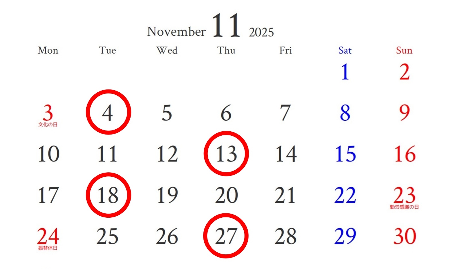 〇印:定休日 2025年11月の定休日は 11/4(火)・11/13(木)・11/18(火)・11/27(木)です。