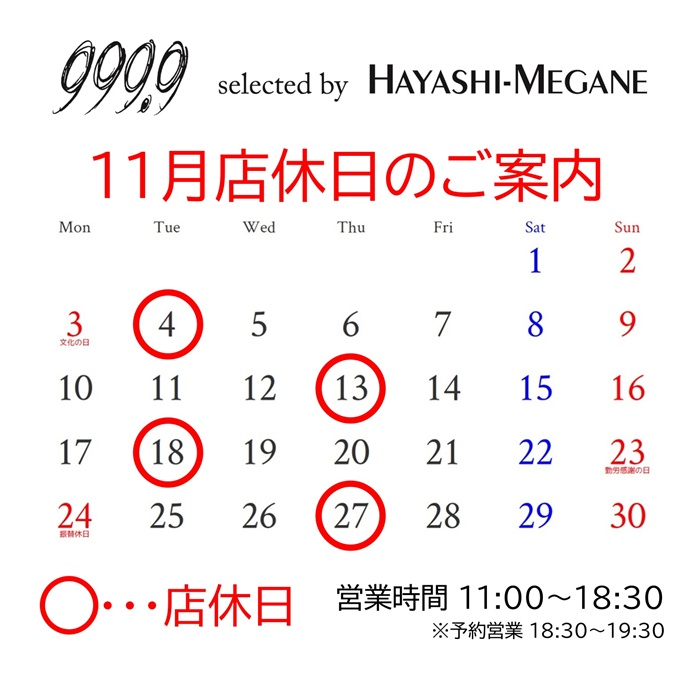 営業時間:11:00~18:30 ※商品のお受け取り・メガネの修理・調整で18:30までのご来店が難しい場合、事前にご連絡いただきましたら19:30まで営業を延長いたします。
